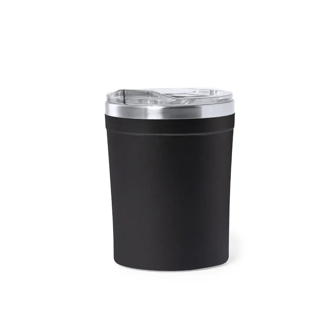 Vaso térmico de sobremesa faricado en acero inox de 350 ml de capacidad. Exterior en PP, con dosificador y abrefácil en tapa. Libre de BPA. Presentado en caja individual de diseño kraft.