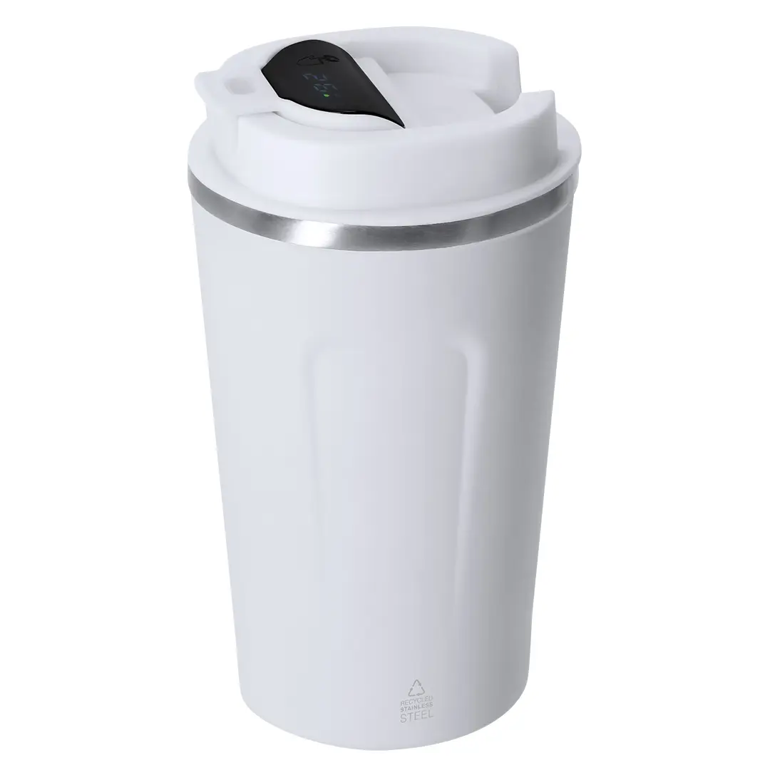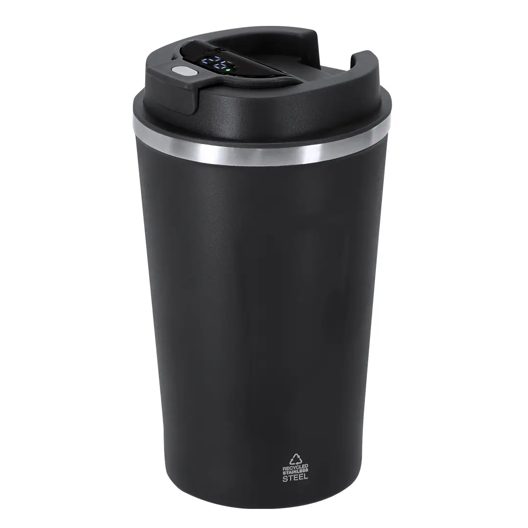 Vaso térmico con capacidad de 400 ml, fabricado en Acero Inoxidable Reciclado. Incorpora pantalla táctil en la tapa que muestra la temperatura interior con solo un toque. Cuenta con tapadera de seguridad para un cierre hermético. Libre de BPA. Incluye distintivo Acero Inox Recliclado. Alimentación a batería. No apto para lavavajillas.