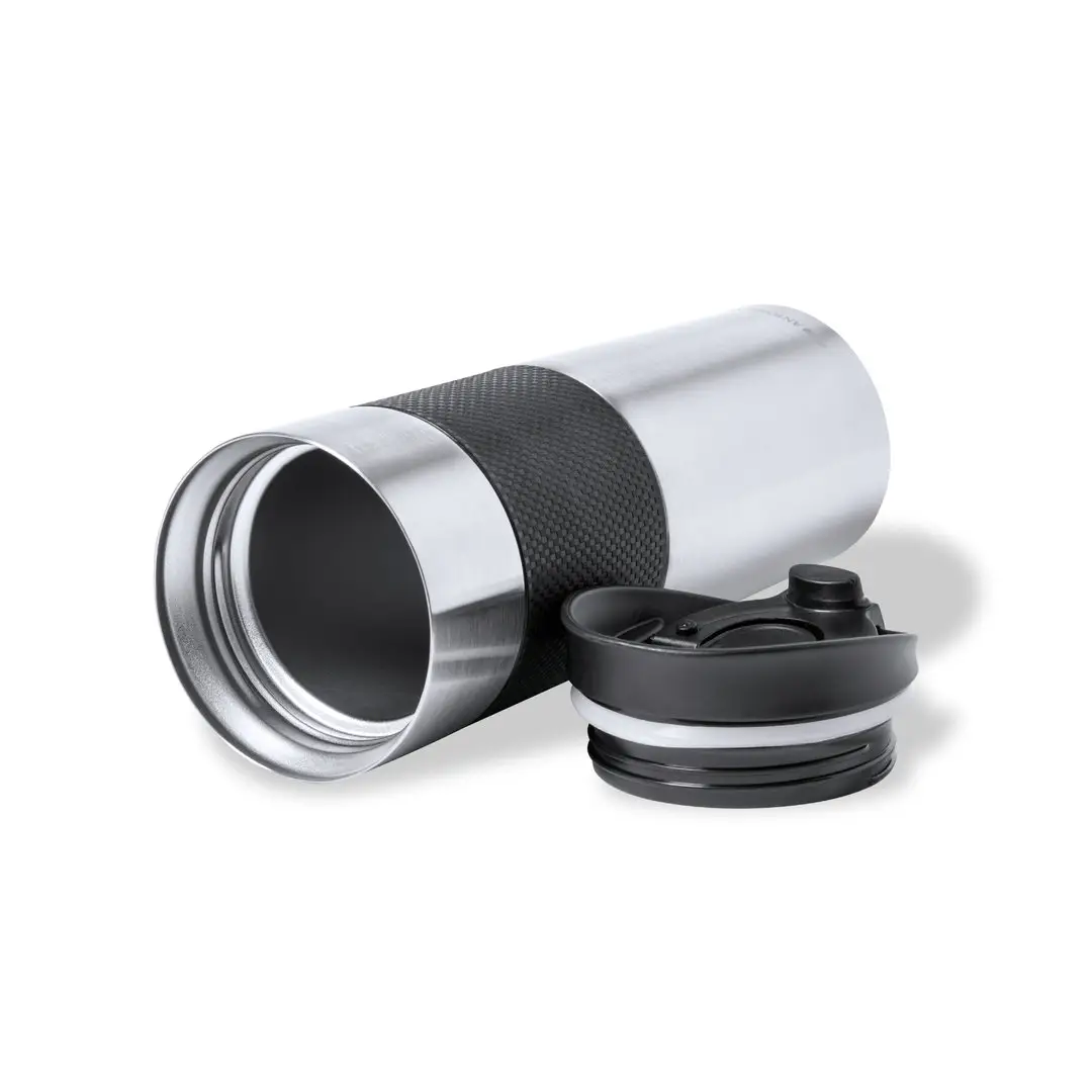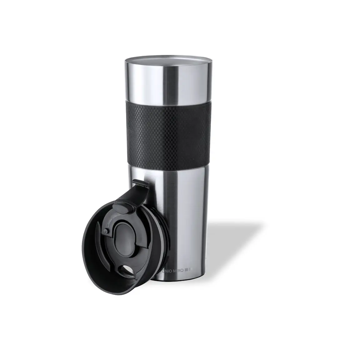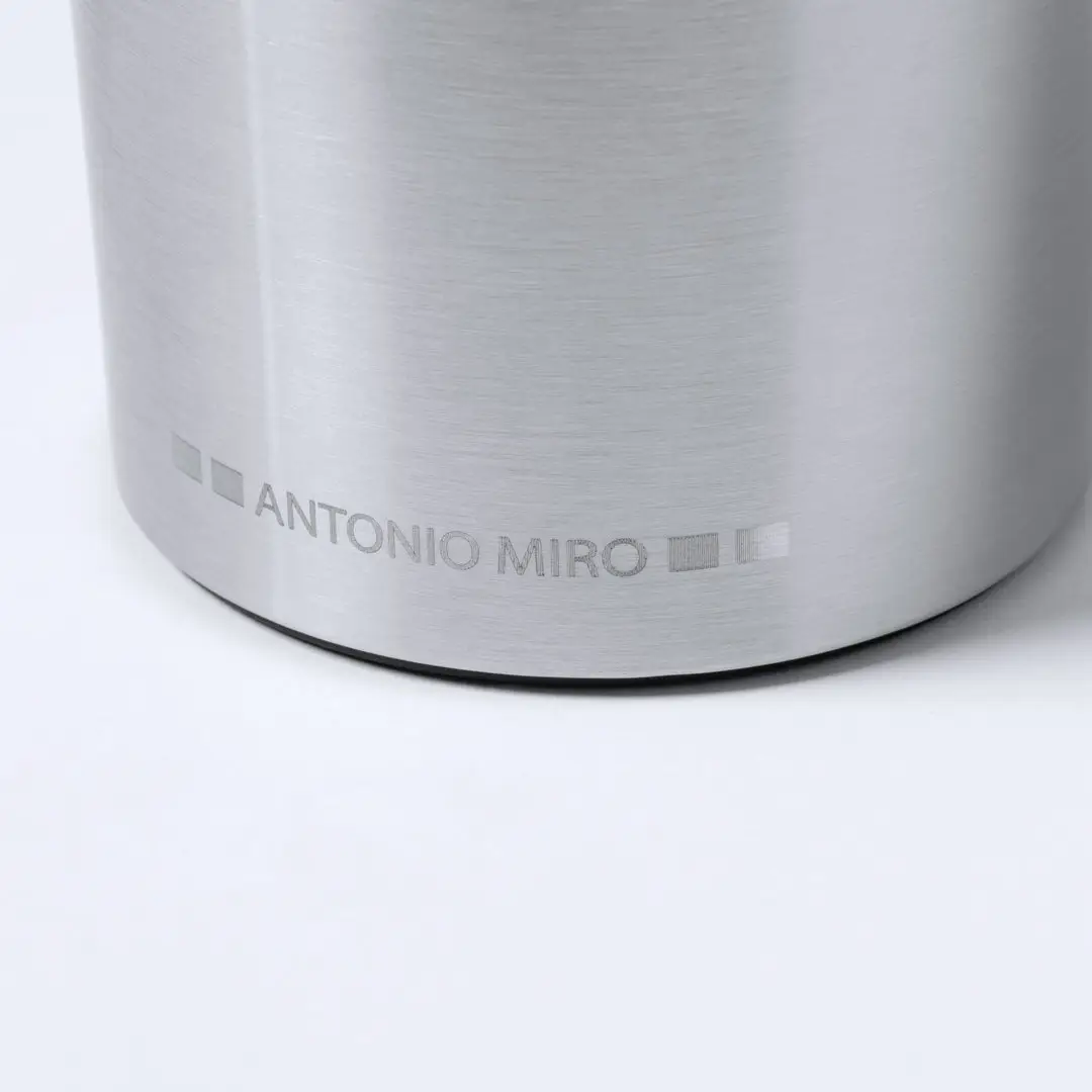 Vaso térmico de sobremesa de Antonio Miró. Fabricado en acero inox de doble pared y 450ml de capacidad. Es ideal para tener en tu escritorio, mesa o en cualquier superficie donde disfrutar tranquilamente de tu bebida favorita. Acabado mate, con elegante tira central y logotipo de la marca en parte inferior. Dosificafor en tapa con abrefácil y libre de BPA. Presentado en elegante caja individual negra con logotipo Antonio Miró.