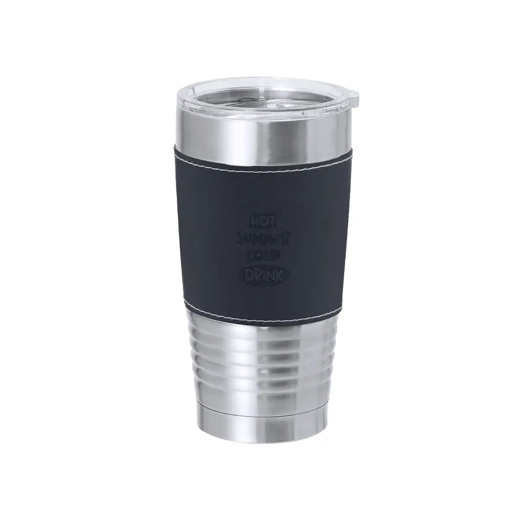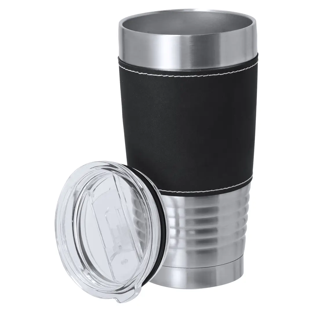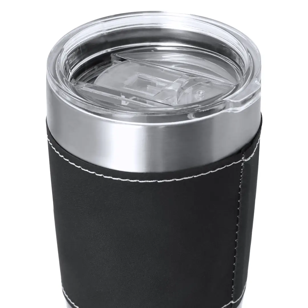 Vaso térmico fabricado en acero inox de doble pared y sofisticada PU. Con 420 ml de capacidad. Incluye elegante banda de PU, confeccionado con distinguidas puntadas blancas. Es ideal para tener en tu escritorio, mesa o en cualquier superficie donde disfrutar tranquilamente de tu bebida favorita. Incluye tapadera transparente con dosificador en tapa y de fácil apertura, libre de BPA.