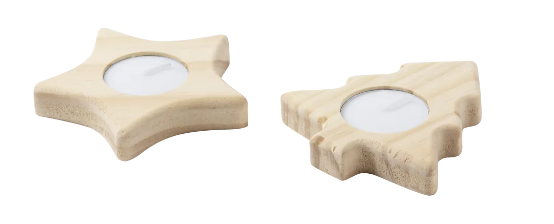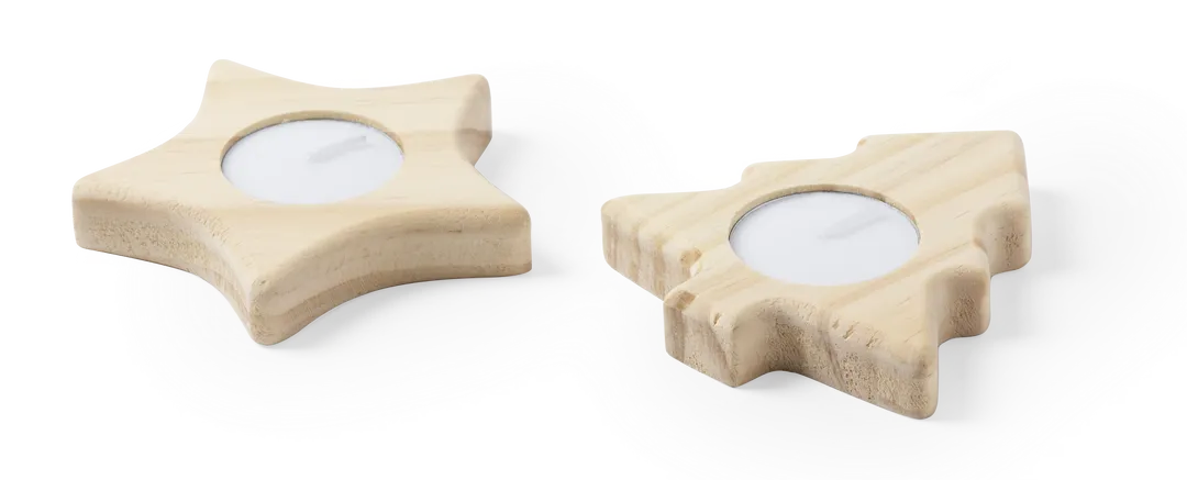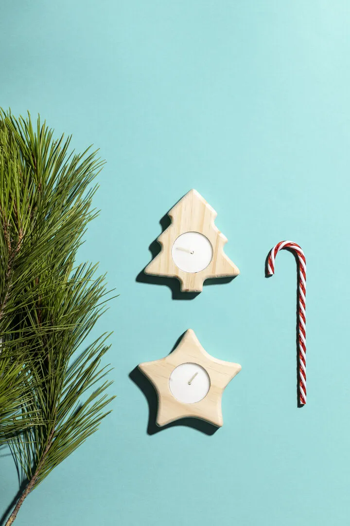 Vela de navidad de madera de pino con originales diseños de estrella y arbolito. Presentada en cajita blanca individual.