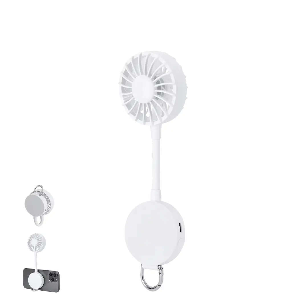 Ventilador multiposición con rotación de 360°, fabricado en ABS de color sólido y equipado con imán magnético para la sujeción con el móvil. Incluye soporte ajustable. En el extremo inferior cuenta con un mosquetón y anilla metálica. Dispone de 3 velocidades regulables mediante botón, e incorpora cable de carga USB A a USB C en el mismo color, junto con una batería de 300 mAh. Diseño compacto, funcional y portátil, ideal para uso personal en exteriores o interiores. Componentes resistentes y ensamblaje magnético para fácil plegado y transporte.