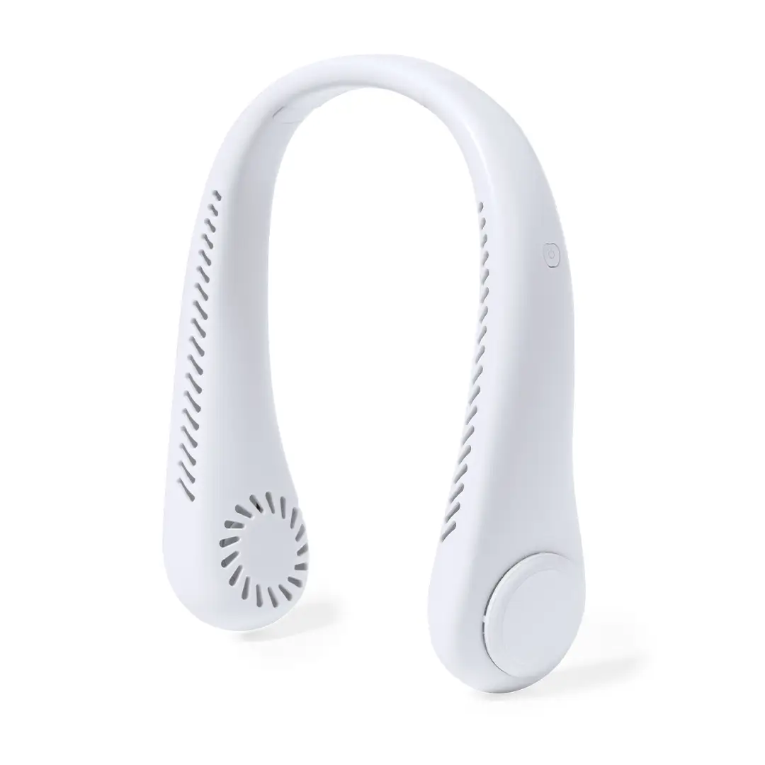 Práctico ventilador portátil fabricado en resistente ABS. Este elegante ventilador tiene un diseño en forma de collar para colocarlo alrededor del cuello, brindando una sensación refrescante. Ofrece tres posiciones de velocidad diferentes y es recargable mediante su batería de 800 mAh, cable Micro USB incluido. Presentado en caja de diseño kraft.